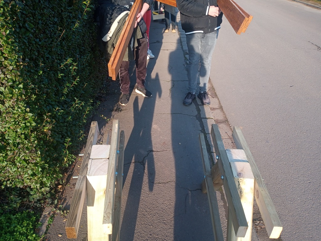 Nochmal eine Woche darauf haben wir die Bank ein zweites mal lasiert und sie dann trocknen lassen. Am Nachmittag hat jeder zwei Holzbretter bekommen und sie dann zum Schulgarten getragen, dabei haben wir uns gegenseitig geholfen: